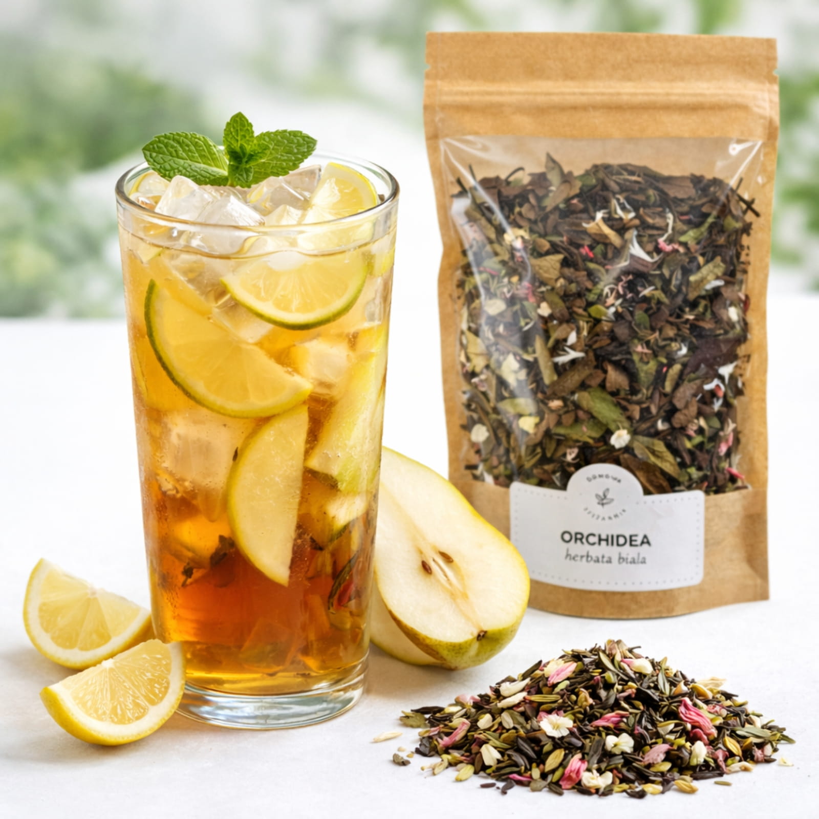Przygotowany i schłodzony napar przelej do szklanki z lodem. Dodaj plasterki gruszki, cytryny i miętę. Taka wersja podania podkreśla owocową świeżość mieszanki i dobrze sprawdza się w ciepłe dni.
