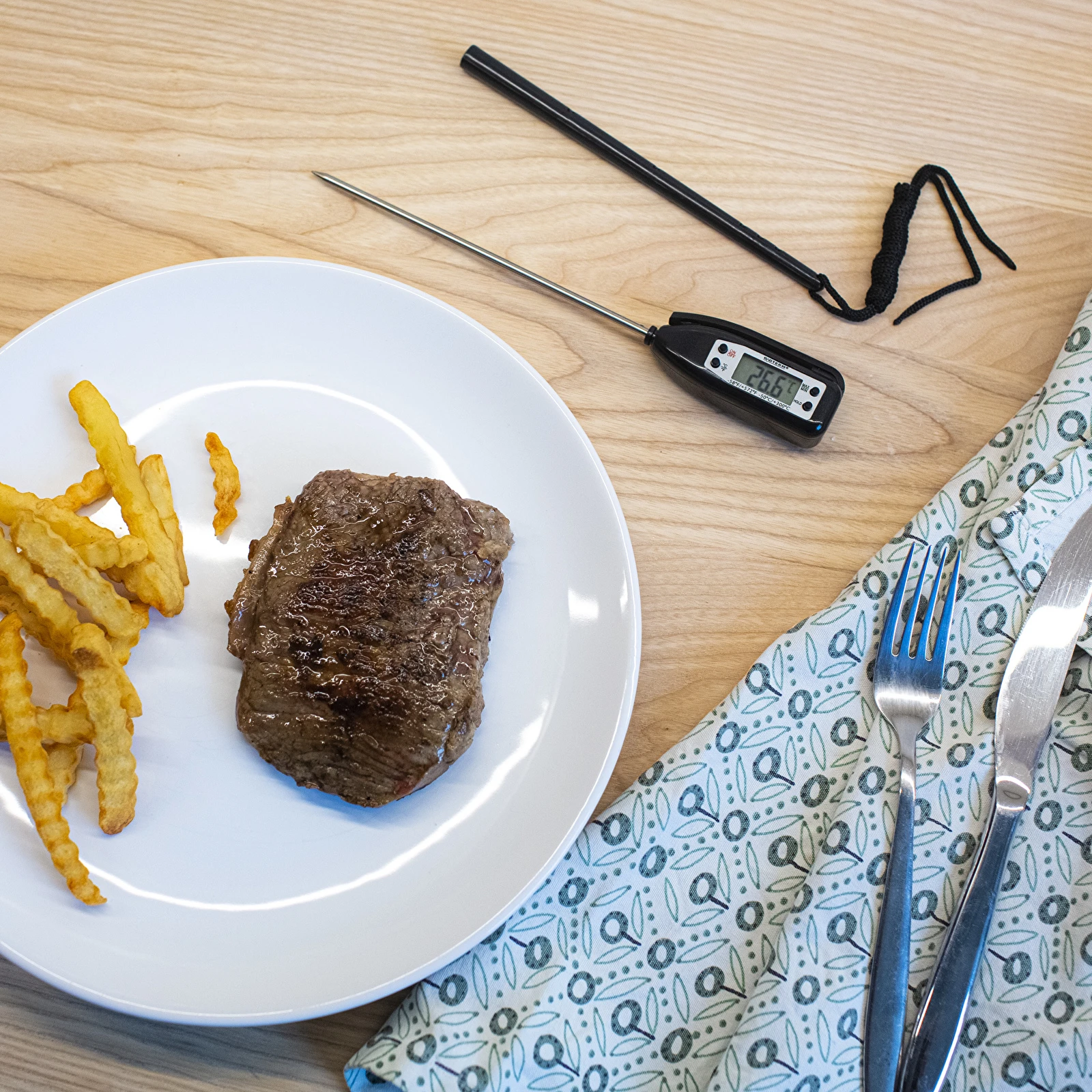 Termometr kuchenny jest uniwersalny do mierzenie temperatury podczas pieczenia i gotowania mięsa. Pozwala kontrolować temperaturę przygotowania takich mięs jak wołowina, wieprzowina czy też mięsa drobiowego. Idealny stek oraz soczyste pieczenie dzięki kontroli temperatury nie sprawią Ci już większego kłopotu. Termometr dzięki dużego zakresu temperatury możesz używać również do pomiaru innych potraw.