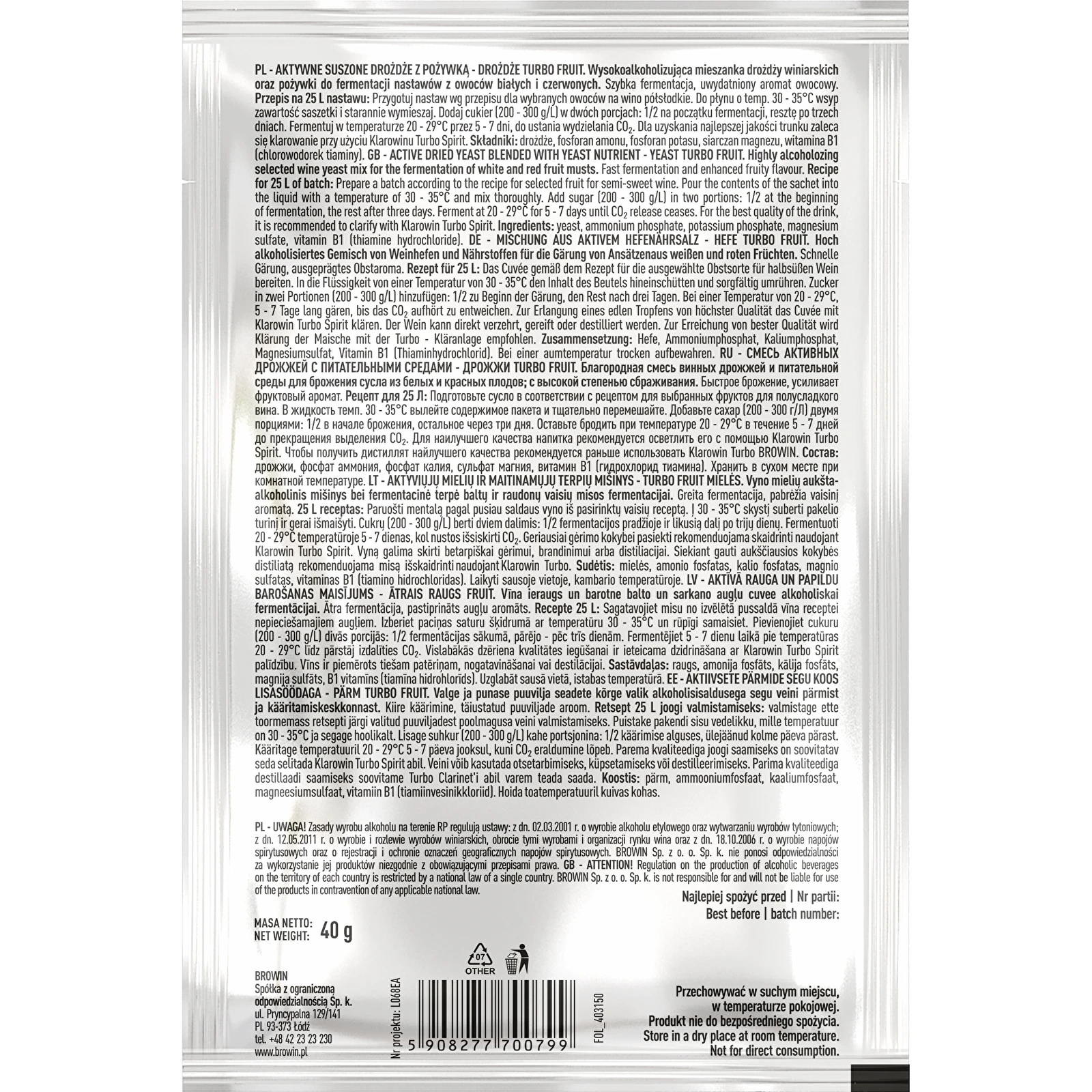 Drożdże gorzelnicze, do bimbru BROWIN TURBO FRUIT 5-7 dni