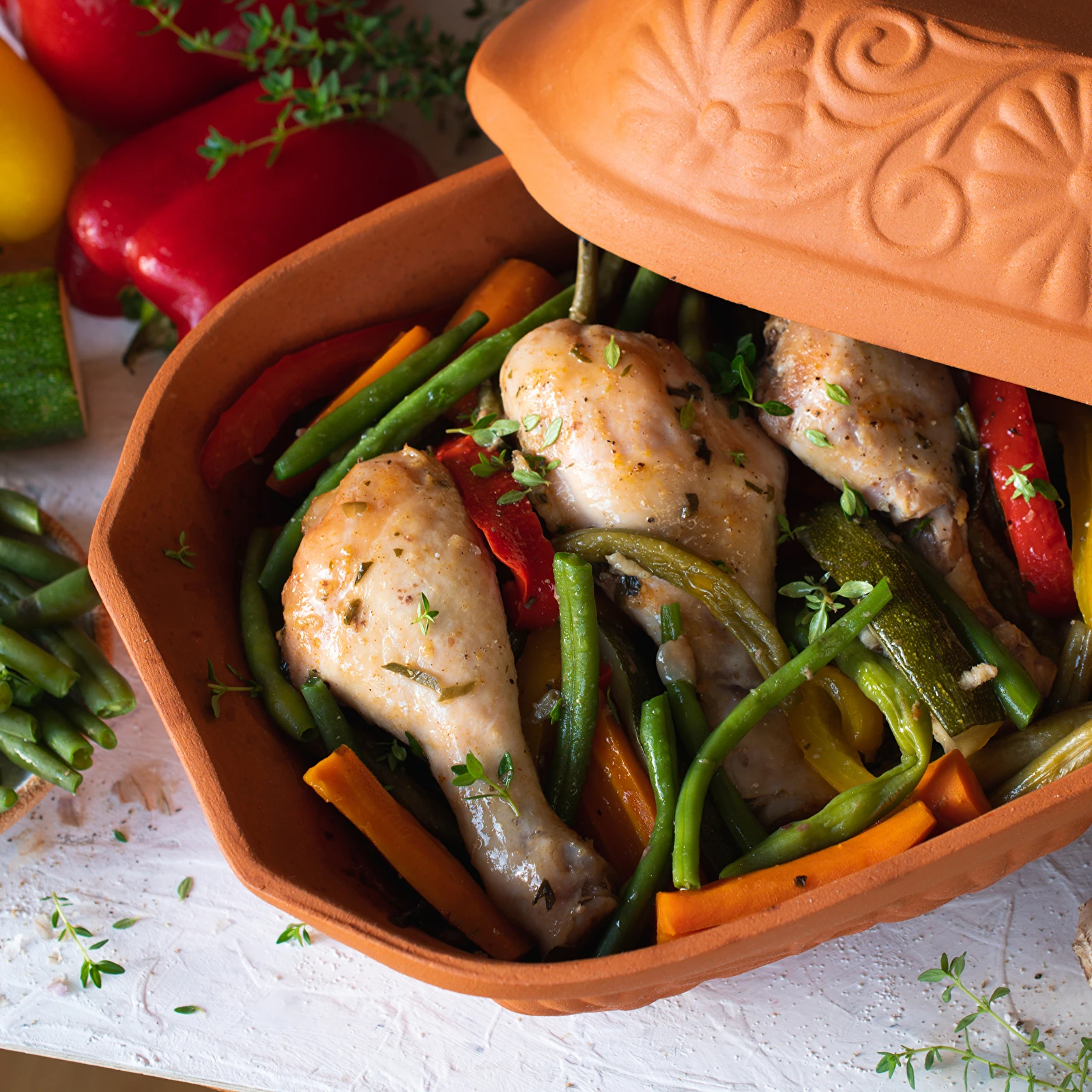 Przed użyciem namocz pusty garnek przez 15 minut w wodzie. Podczas pieczenia woda, którą nasiąknęło naczynie, paruje i tworzy się warstwa pary wodnej zarówno w garnku, jak i w piekarniku.