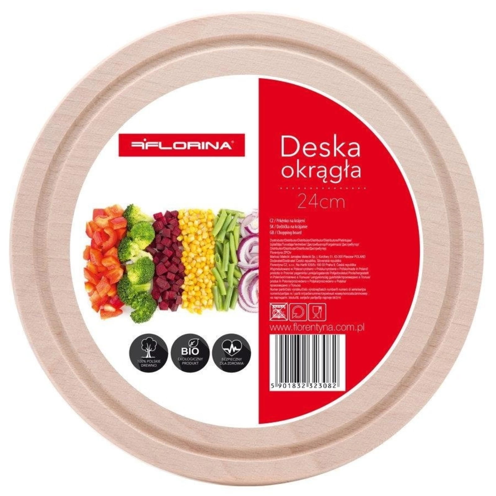 Deska kuchenna Florina okrągła mała 24 cm to piękne i praktyczne akcesorium, które wnosi do kuchni naturalny klimat i codzienną wygodę. Wykonana z naturalnego drewna bukowego, zachwyca prostą formą, subtelnym rysunkiem słojów i uniwersalnym wyglądem, który pasuje zarówno do nowoczesnych, jak i bardziej klasycznych wnętrz.
