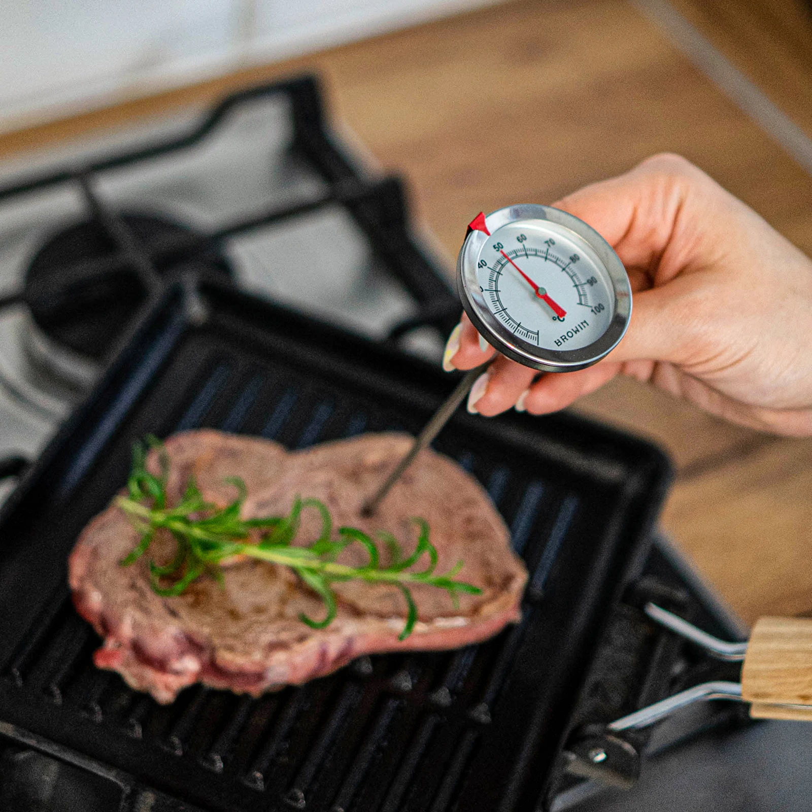 Termometr kuchenny jest uniwersalny do mierzenia temperatury podczas pieczenia i gotowania mięsa. Pozwala kontrolować temperaturę przygotowania takich mięs jak wołowina, wieprzowina czy też mięsa drobiowego. Idealny stek oraz soczyste pieczenie dzięki kontroli temperatury nie sprawią Ci już większego kłopotu. Termometr dzięki dużego zakresu temperatury możesz używać również do pomiaru innych potraw.